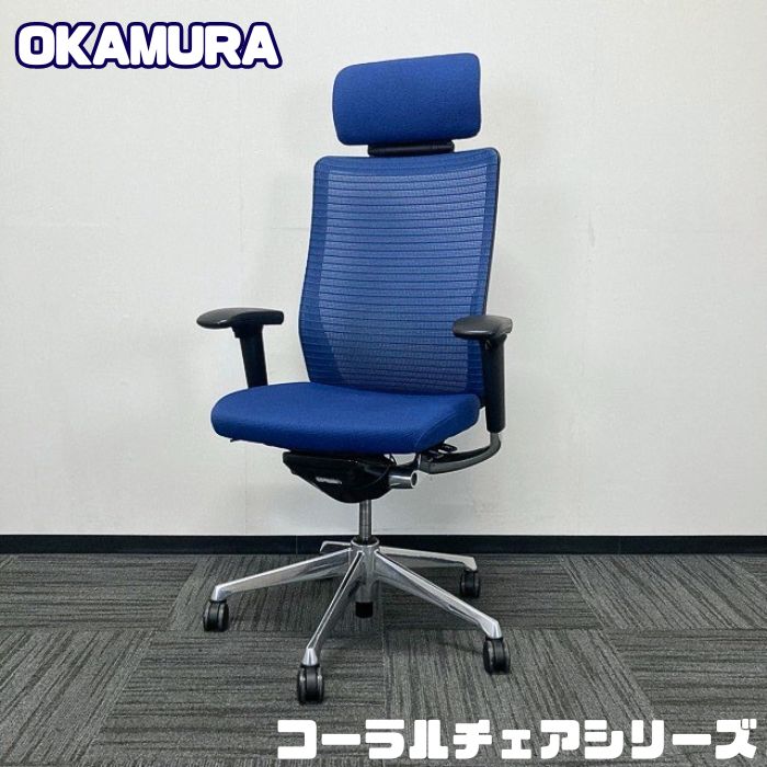 オカムラ コーラルチェアシリーズ オフィスシーティング[アジャストアーム] CQ8ABS FSH3 ヘッドレスト ミディアムブルー 2019年製 中古