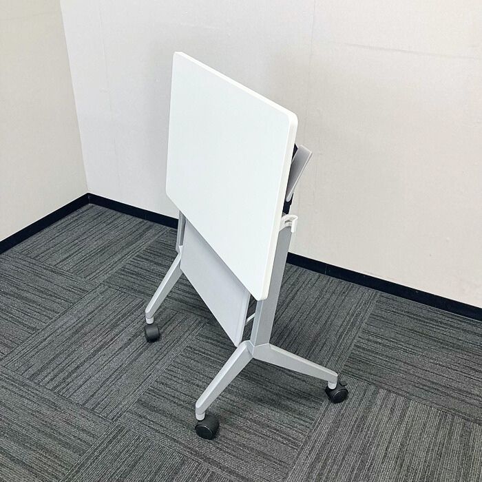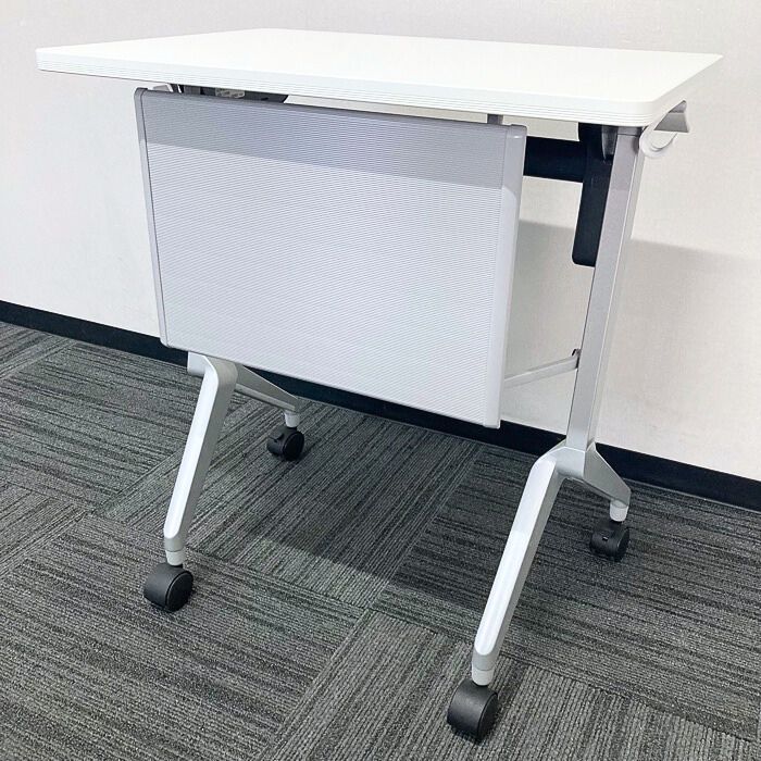キャスター付きで移動も手軽に行なえ、使用されない場合は天板を跳ね上げ重ねて収納可能です。
