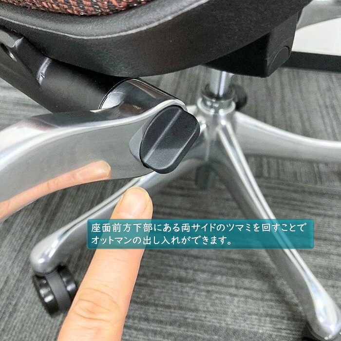 業務に集中される場合は前傾チルト姿勢で使用し、リラックスしたい時はオットマンを使って、ON/OFFの切り替えをスムーズに行え、より効率的にデスクワークを行えます。