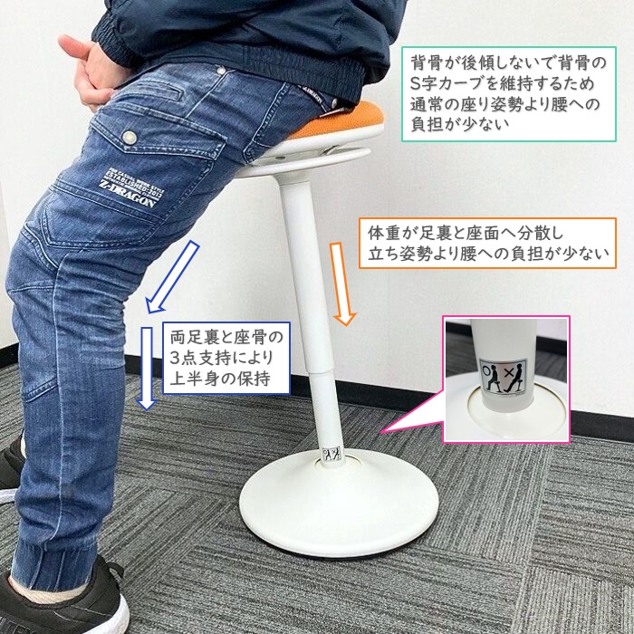 スイング脚タイプの特徴として座り姿勢よりも腰の負荷が少なく、立ち姿勢よりも足が疲れにくくなっています。