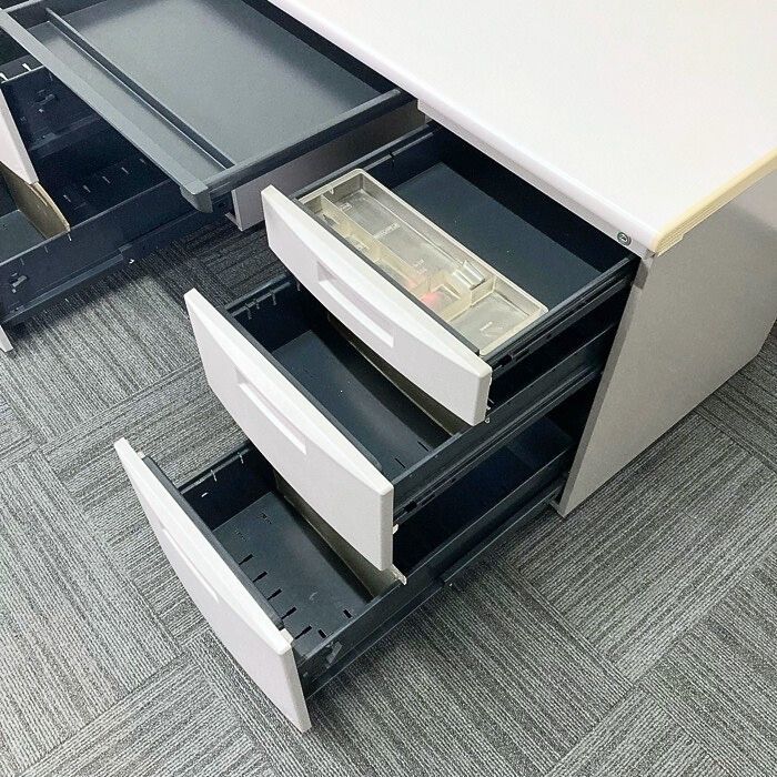 収納箇所はセンター引出し、左2段袖、右3段袖とたっぷり御座います。