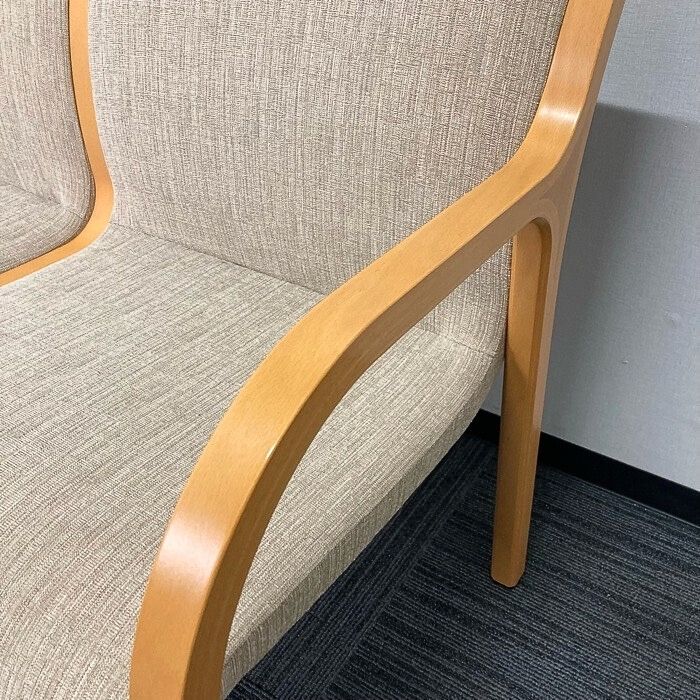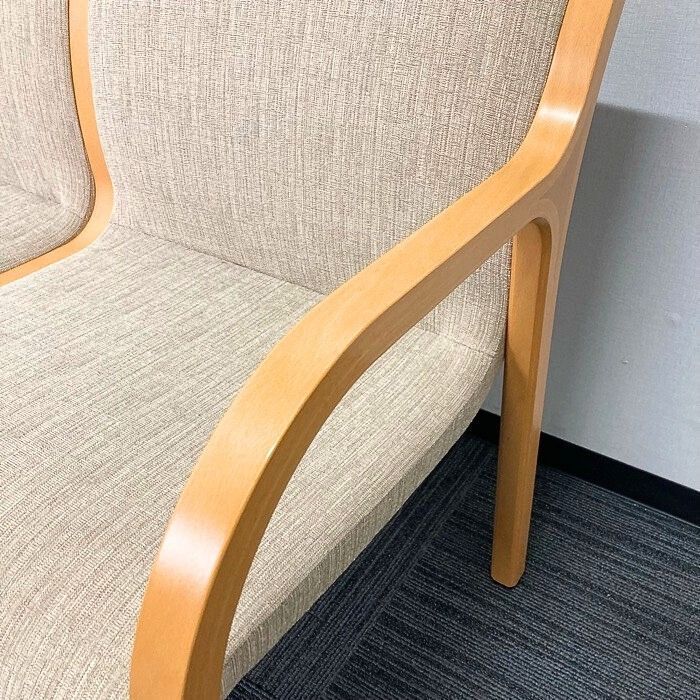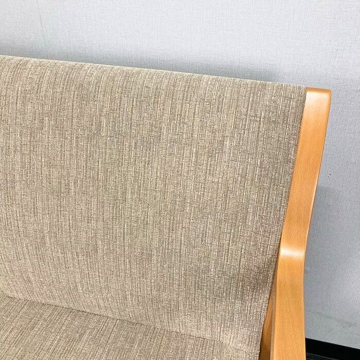 落ち着いたベージュ色と木目の肘掛けで暖色系の温かみのある色合いとなります。