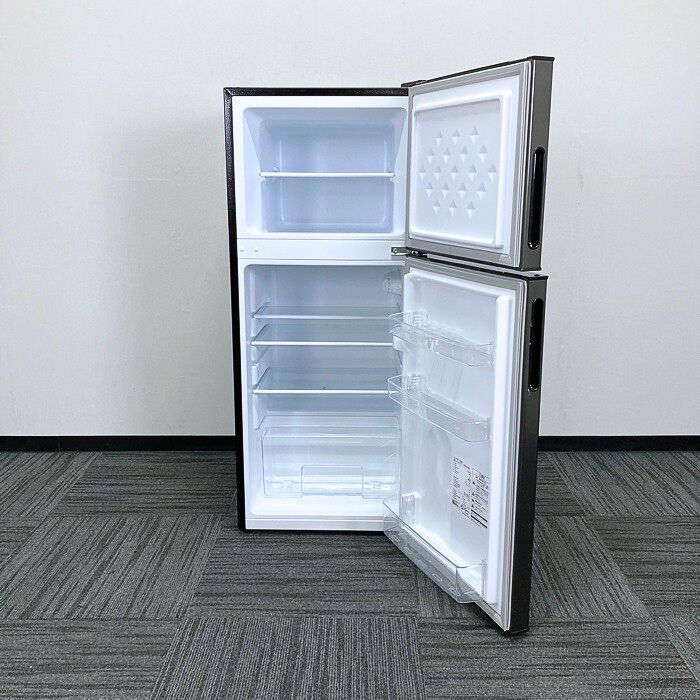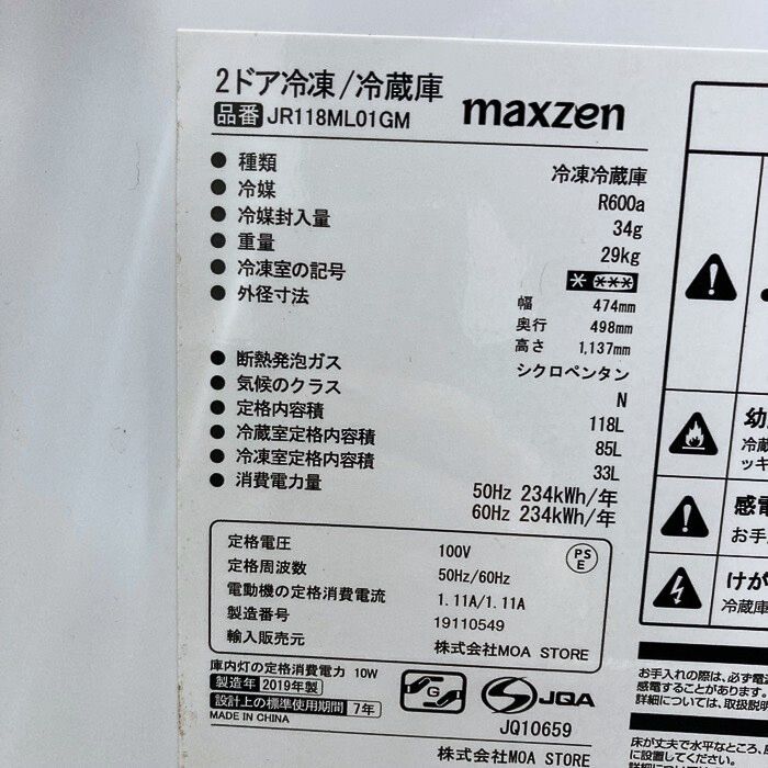 マクスゼン 2ドア冷凍冷蔵庫 JR118ML01GM 寸法:W495×D520×H845 容量:118L ドア:ガンメタリック/本体:ブラック 2019年製 中古