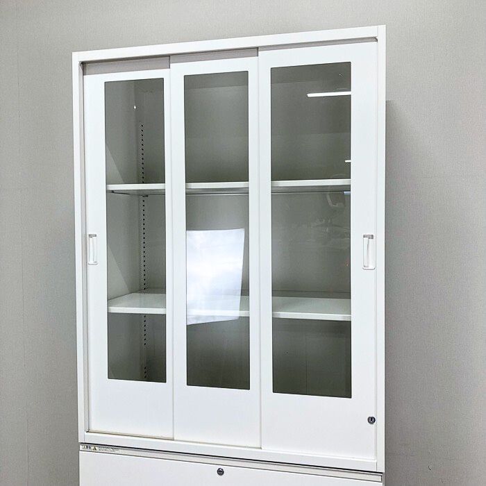 イトーキ シンラインキャビネットシリーズ 引違い3枚ガラス扉+ラテラルキャビネット W800×D450×H2136 ホワイト 2013年製 中古 ⑩