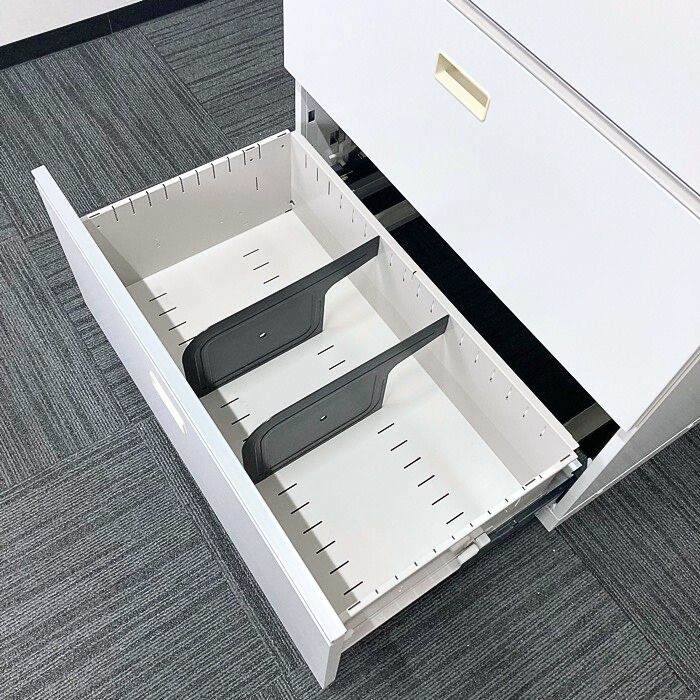 下置きのラテラルキャビネットも下段でも腰を屈めるだけでファイルを取り出せるので身体への負担も軽減できます。