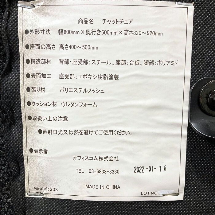 オフィスコム チャットチェアシリーズ オフィスチェア ブラック 2022年製 中古 ⑳