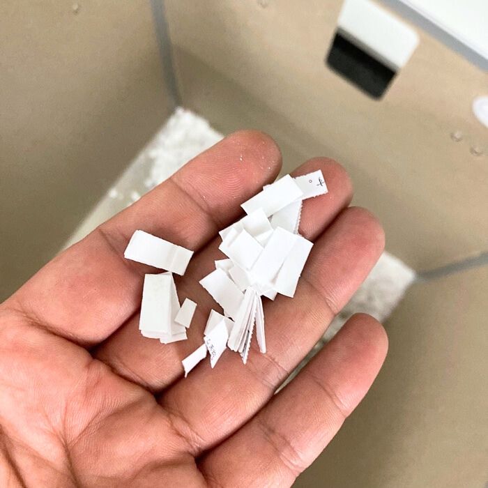 細断する紙の投入量に応じて色が変化し、過投入による紙詰まりを防止します。投入前の電源ON時は「青」、投入後の最適枚数時は「緑」、多めの時は「黄」~「橙」~「赤」と色が変化します。「緑」の状態で使用して頂くのが理想です。