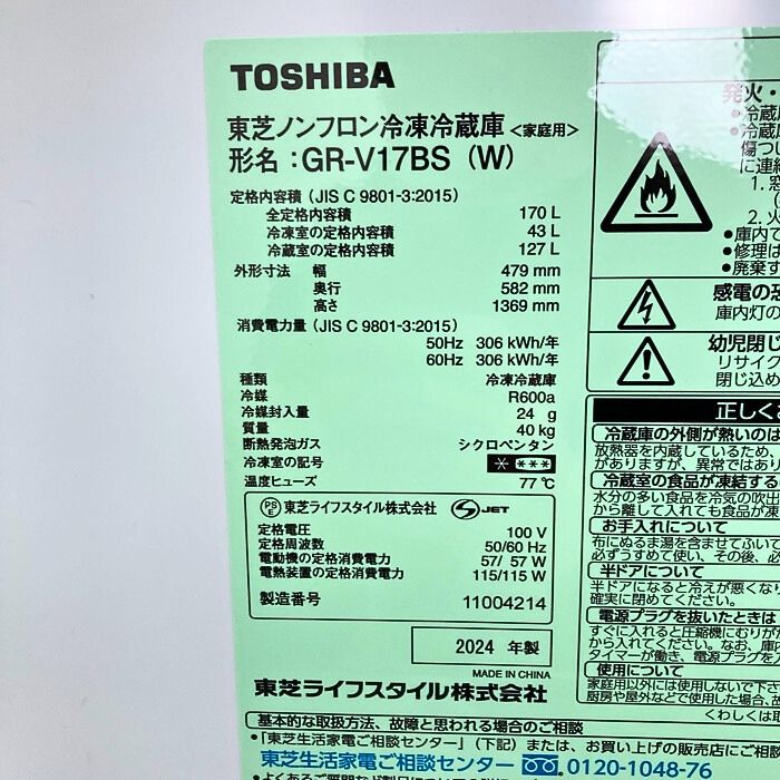 東芝 BSシリーズ 冷蔵冷凍庫 GR-V17BS(W) W479×D582×H1369 定格内容積:170L セミマットホワイト 2024年製 中古