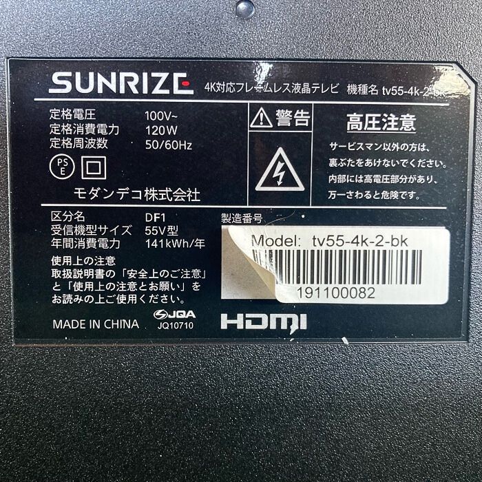 サンライズ HDR搭載 4Kテレビ 55型 液晶テレビ mini B-CASカード付属 ブラック 2019年製 中古 ※スタンドは付属しておりません。
