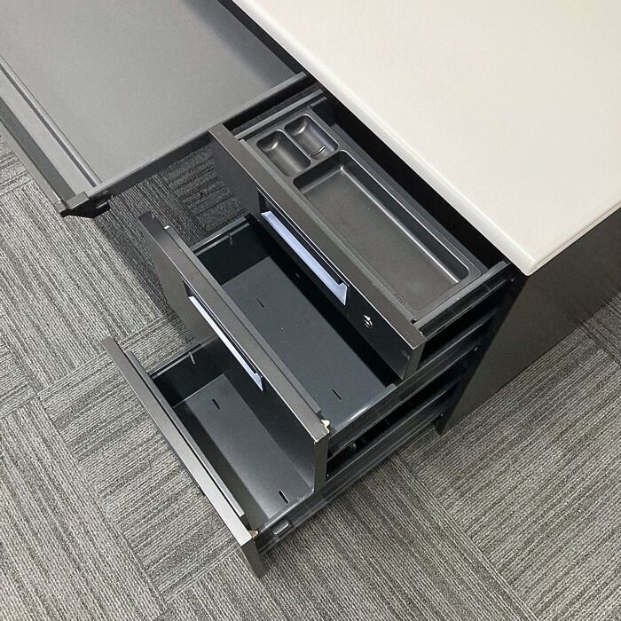 配線孔は天板後方に1箇所あり、引き出しはセンター引き出しと右袖の2種類備えております。