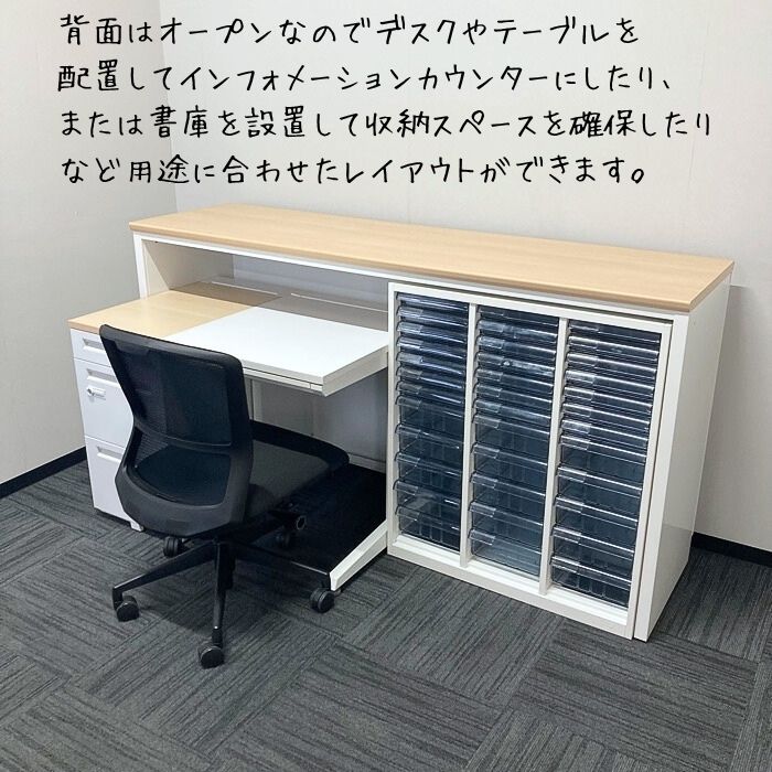 背面はオープンタイプで奥行きが御座いますので背の低い書庫や棚の配置も可能です。