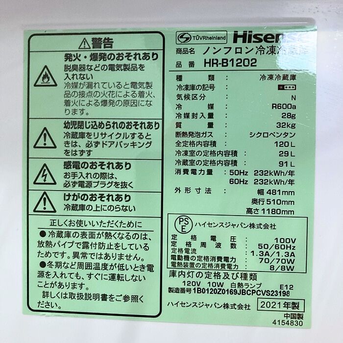 ハイセンス 冷凍冷蔵庫 HR-B1202 W481×D510×H1180 全定格内容積:120L ホワイト 2021年製 中古