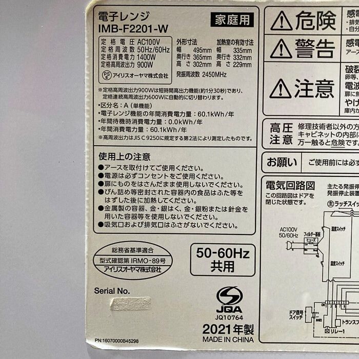 アイリスオーヤマ 電子レンジ 22L IMB-F2201-W ホワイト 2021年製 中古
