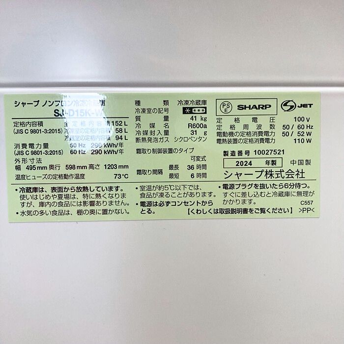 SHARP 冷凍冷蔵庫 SJ-D15K-W W495×D598×H1203 定格内容積:152L マットホワイト 2024年製 中古