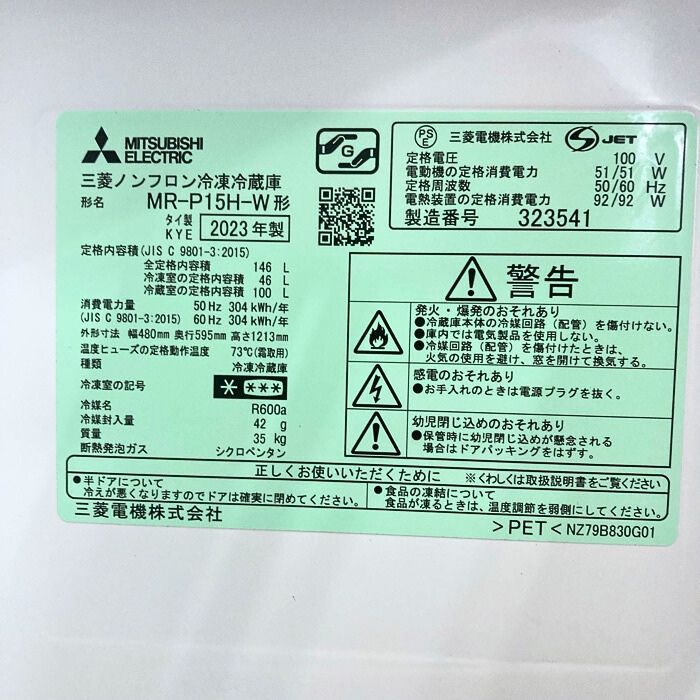 MITSUBISHI 冷凍冷蔵庫 MR-P15H-W W480×D595×H1213 定格内容積:146L ホワイト 2023年製 中古