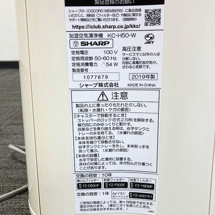 SHARP プラズマクラスター 加湿空気清浄機 KC-H50-W ホワイト 2020年製 中古