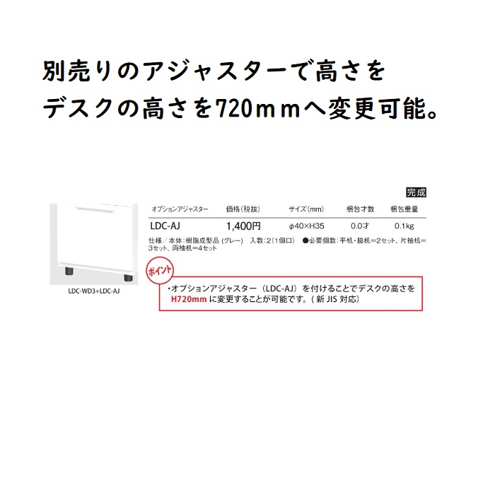 別売りのアジャスターに付け替えることでデスクの高さを720mmに変更可能です。※片袖デスクの場合はアジャスターが6個必要になります。